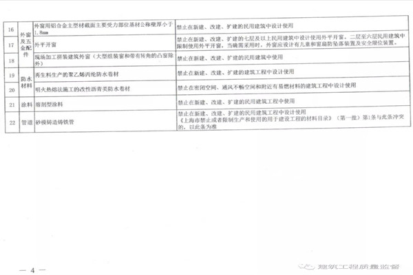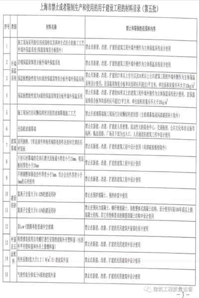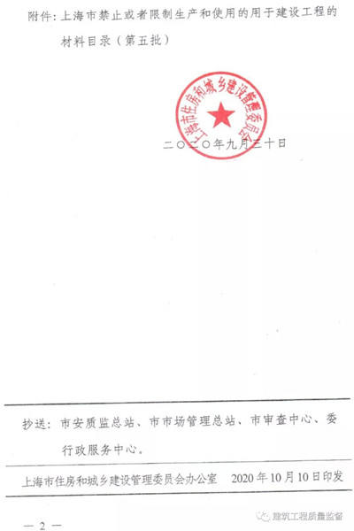 2020年9月30日,上海市住房和城市建設(shè)管理委員會(huì)關(guān)于公布《上海市禁止或者限制生產(chǎn)和使用的用于建設(shè)工程的材料目錄《(第五批)》的通知