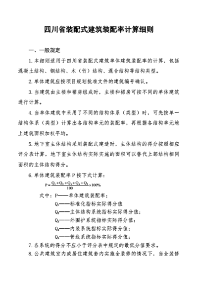 要點(diǎn):《四川省裝配式建筑裝配率計算細(xì)則(試行)》實施以來,對全省裝配式建筑裝配率計算起到了積極的指導(dǎo)和規(guī)范作用。為進(jìn)一步推動我省裝配式建筑的發(fā)展,規(guī)范裝配率計算,提升標(biāo)準(zhǔn)化建設(shè)水平,推進(jìn)系統(tǒng)集成技術(shù)發(fā)展應(yīng)用,我廳組織相關(guān)單位進(jìn)行了修訂,并經(jīng)專家審查通過,形成了《四川省裝配式建筑裝配率計算細(xì)則》,現(xiàn)予印發(fā),自 2020 年 10 月 1 日起實施。
